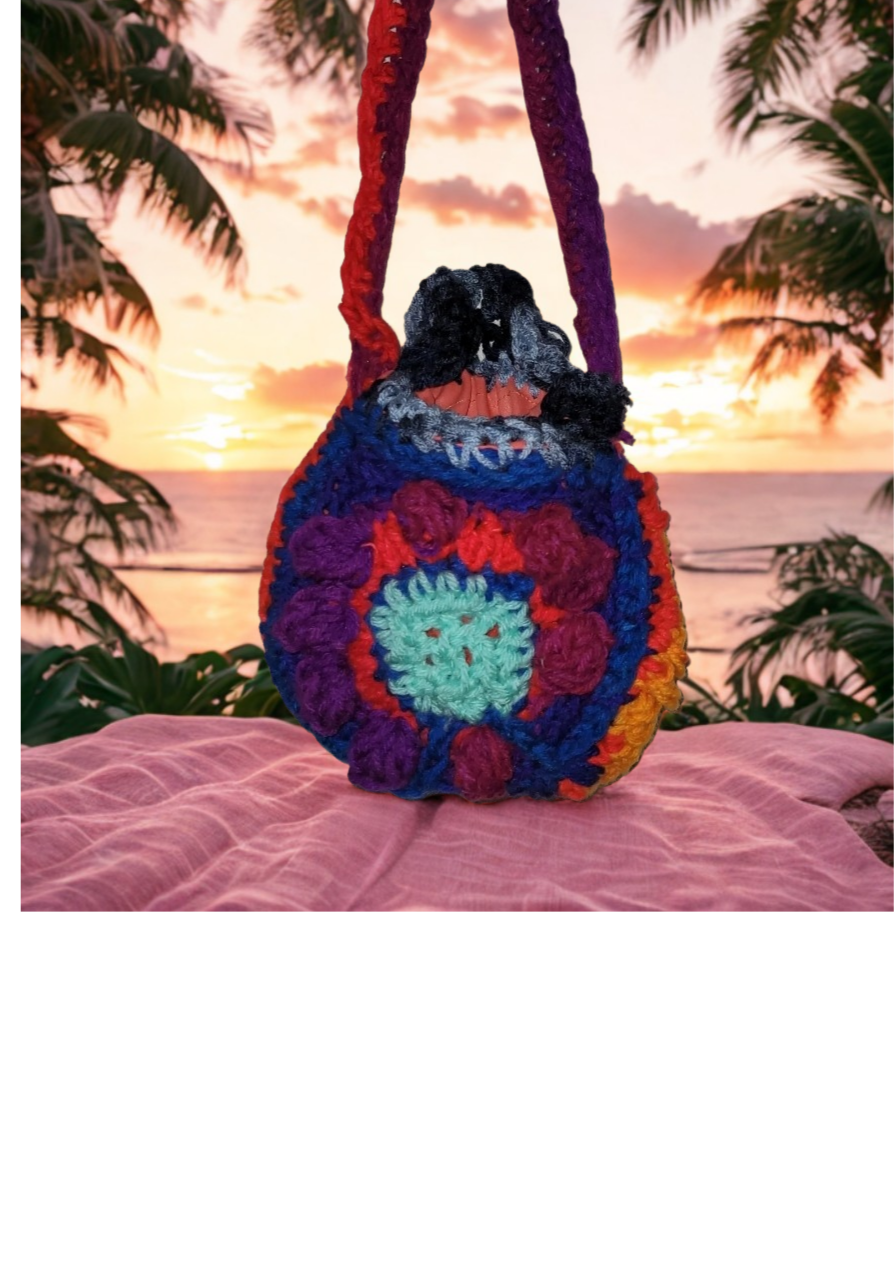 Colorful freeform crochet bag with a cotton lining and pocket inside featuring neon yellow and blue tones.