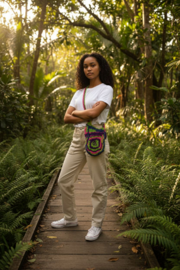 Freeform unique purse with cotton lining. Pink, teal, purple blue. The closure is yellow.