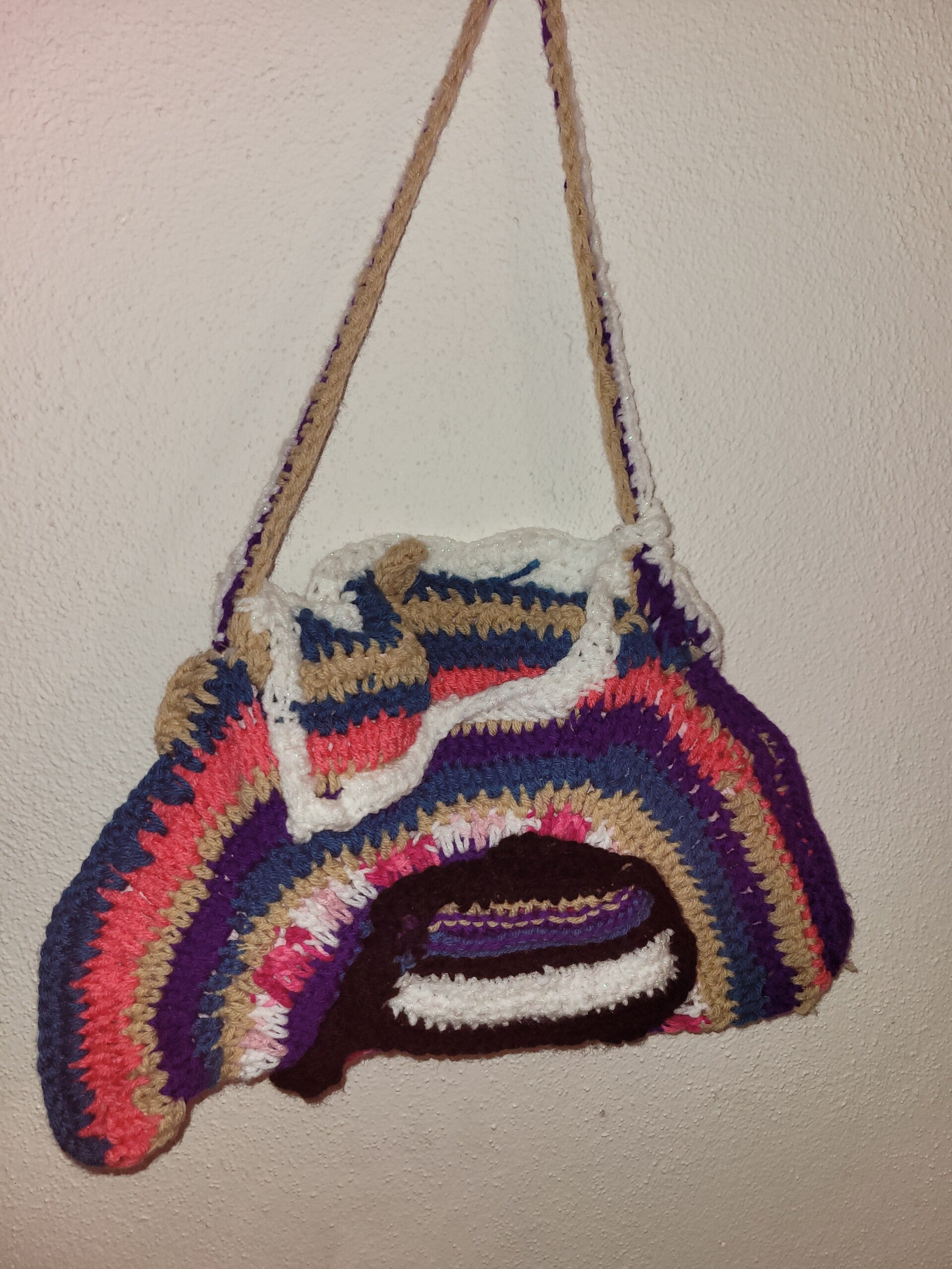 White, tan, blue black and pops of pink and purple. Comes with a lining and pockets.