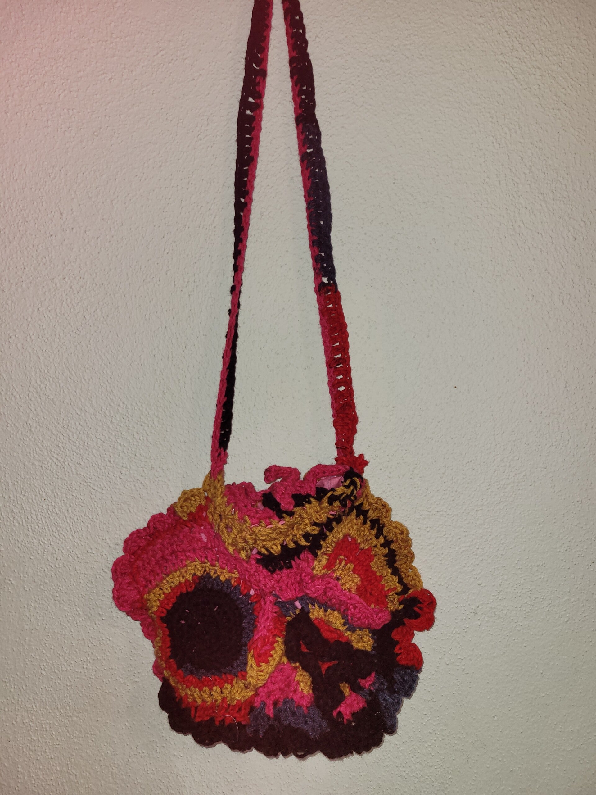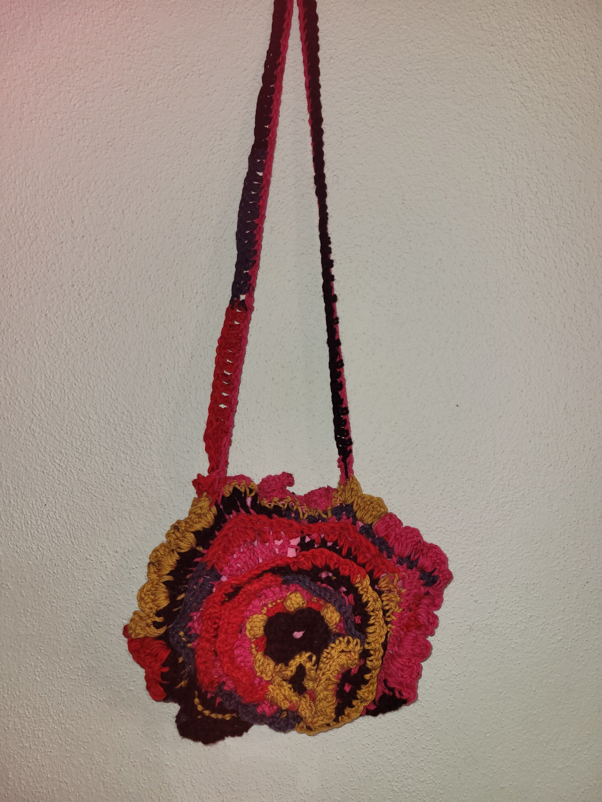 Gold, pink, black freeform crochet bag with a lining and pocket